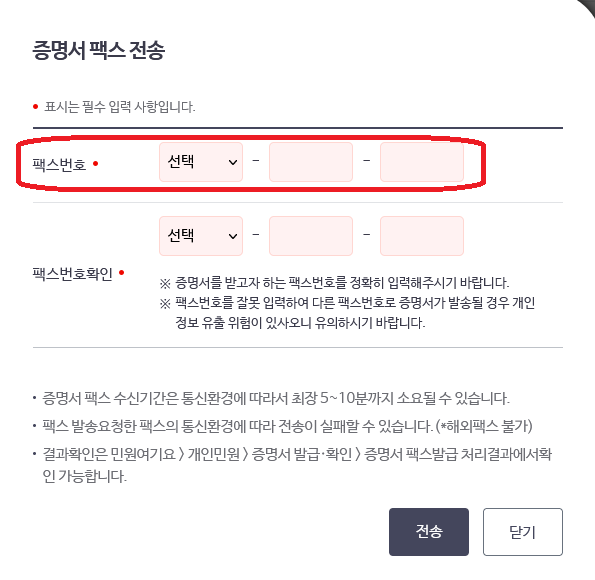 -팩스전송 : 확인서를 필요로 하는 기관에 팩스 전송